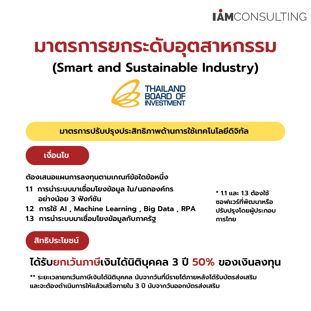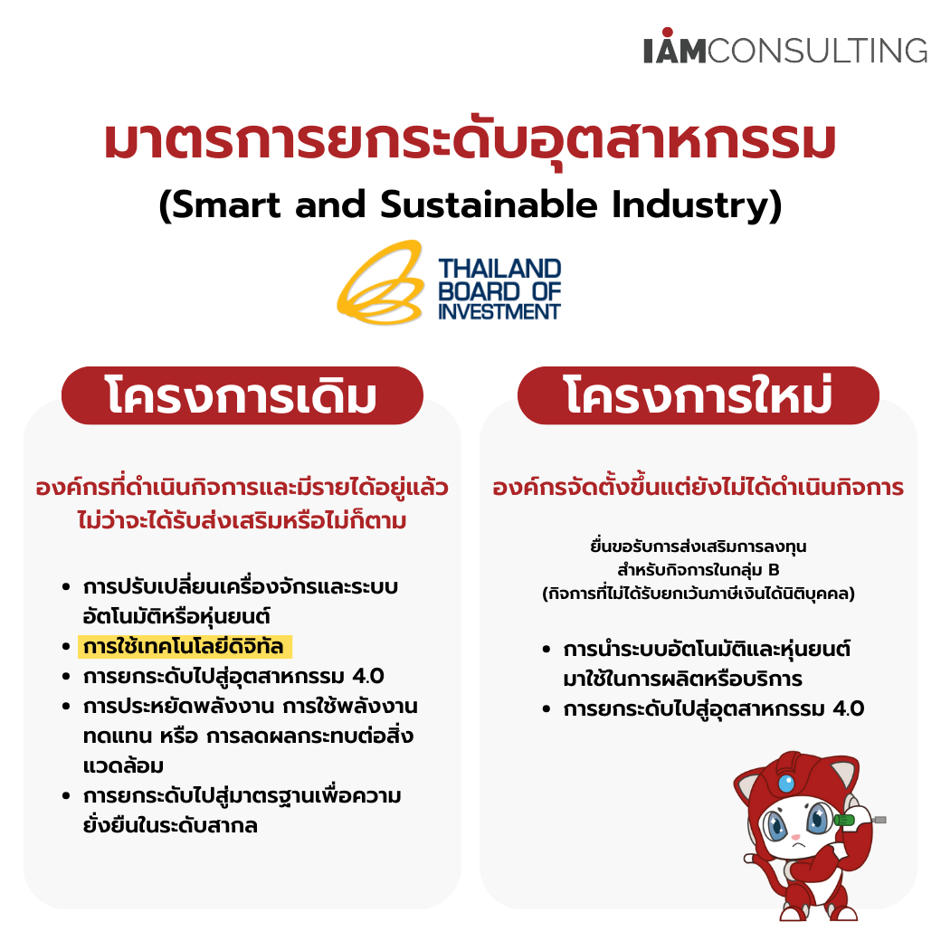ปัจจุบัน สำนักงานคณะกรรมการส่งเสริมการลงทุน (BOI) ต้องการส่งเสริมธุรกิจทั้งภาคการผลิตและภาคบริการของประเทศไทยให้เร่งเปลี่ยนผ่านไปสู่อุตสาหกรรมอัจฉริยะและยั่งยืน จึงขยายมาตรการยกระดับอุตสาหกรรม (Smart and Sustainable Industry) ซึ่งนับเป็นโอกาสดีที่ผู้ประกอบการไม่ควรพลาด!