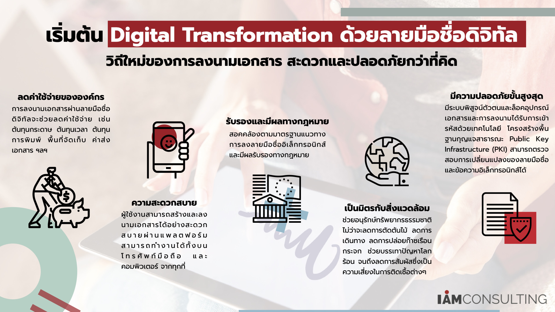 ยุคดิจิทัลแบบนี้ต้องยอมรับว่ามีหลายหน่วยงานทั่วโลกที่ไม่ได้เซ็นเอกสารบนกระดาษอีกต่อไป และหันมาใช้วิธีการอิเล็กทรอนิกส์ทั้งหมด แต่ทั้งองค์กรหรือคู่ค้าบางราย อาจยังไม่เข้าใจว่า e-Signature กับ Digital Signature คืออะไร และ มีข้อแตกต่างกันยังไง แล้วองค์กรจะเลือกใช้งานแบบใดจึงจะเหมาะสม สามารถอ่านสรุปได้จากบทความของ I AM Consulting ตามด้านล่างนี้ e-Signature e-Signature คือ ลายมือชื่ออิเล็กทรอนิกส์แบบทั่วไป ย่อมาจาก Electronic Signature โดยจะอยู่ในรูปแบบของ การเซ็นชื่อ, การอัปโหลดรูปภาพลายเซ็น, การพิมพ์ชื่อเป็นตัวอักษร, การใช้ Username-Password บนเว็บไซต์หรือแอปพลิเคชั่น, หรือแม้กระทั่งการคลิกปุ่มยอมรับ ( Submit ) ในแบบฟอร์มต่างๆ เป็นต้น e-Signature ที่กฎหมายรองรับ ( กฏหมายมาตรา 9 ของ พ.ร.บ. ว่าด้วยธุรกรรมทางอิเล็กทรอนิกส์ฯ ) จะต้องมี 3 องค์ประกอบนี้  1.    ระบุเจ้าของลายมือชื่อได้ว่าเป็นของใคร2.    ระบุเจตนาของเจ้าของลายมือชื่อต่อข้อความที่ลงนาม3.    ใช้วิธีการที่เชื่อถือได้ แม้ว่า e-Signature […]