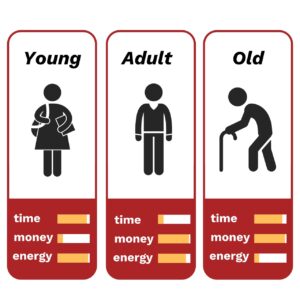 3.วัยชรา เรามีทั้งเวลาและมีเงินแต่เราขาดพลังงาน มีสุขภาพที่ดีเหมือนแต่ก่อน เพราะเราเริ่มแก่ตัว คนมีอายุหลายๆคนก็หาเวลาไปออกกำลังกาย เล่นกีฬาที่ตัวเองชื่นชอบ เพื่อเสริมสร้างสุขภาพให้แข็งแรง