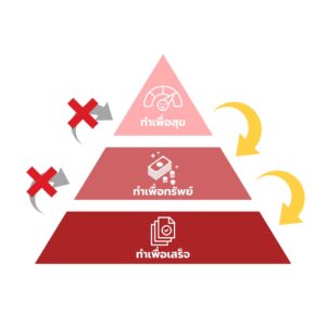 ภาพนี้ทุกคนจะเห็นเป็นภาพพีระมิดที่มี 3 ชั้นโดยเรียงลำดับจากยอดมาฐานเป็น ทำเพื่อสุข,ทำเพื่อทรัพย์,ทำเพื่อเสร็จ ปัจจัยที่อยู่สูงกว่ามักจะส่งผลต่อต่อปัจจัยที่อยู่ถัดลงมา แต่ปัจจัยที่อยู่ต่ำกว่าไม่จำเป็นที่จะต้องส่งผลต่อปัจจัยที่อยู่สูงกว่า ผมขอขยายความดังนี้ครับ